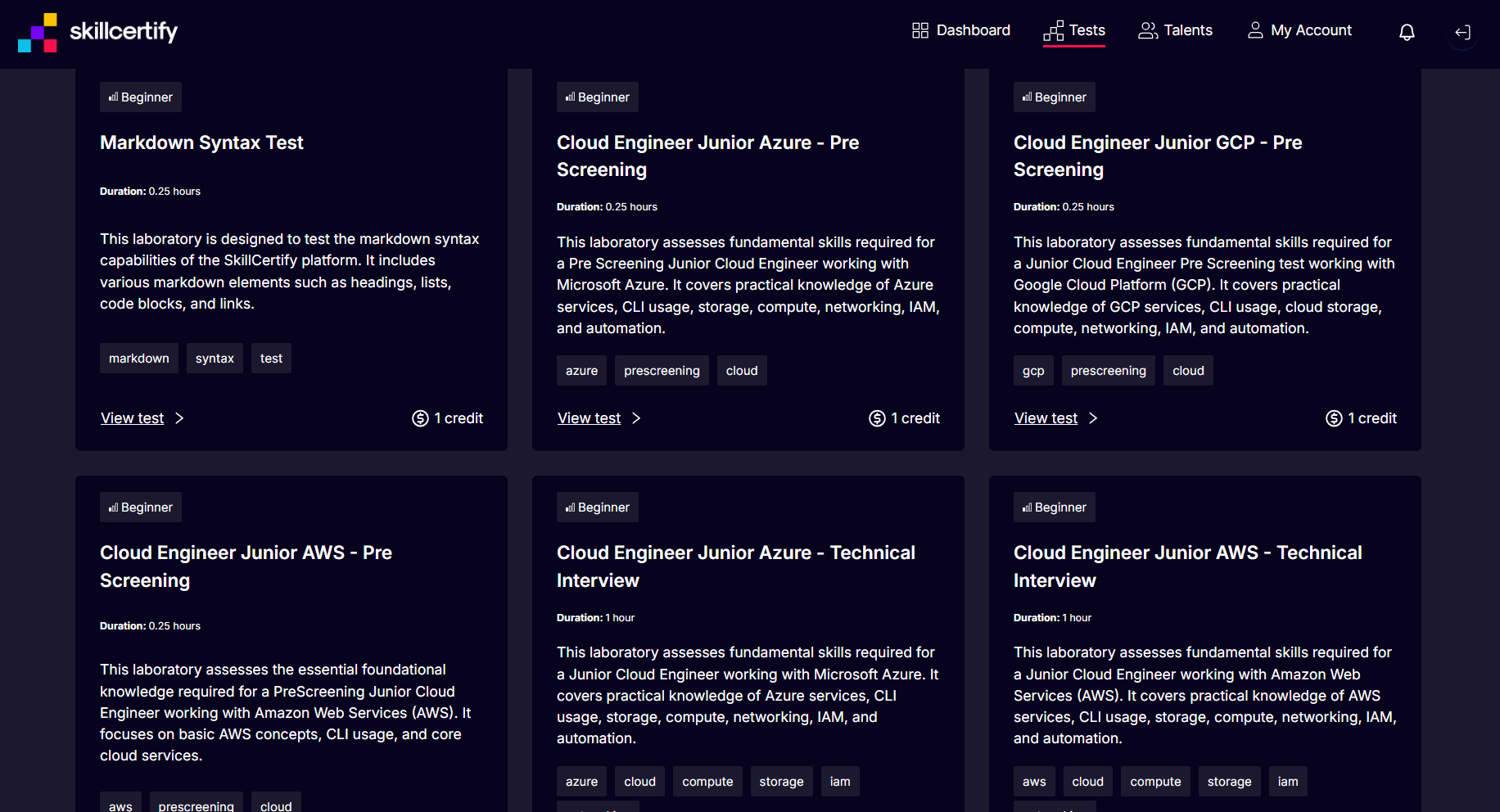 Most platforms give candidates a code editor and a problem to solve. SkillCertify provides them with a complete, isolated workspace, accessible from any device, built around the real scenarios they'll face on your team.